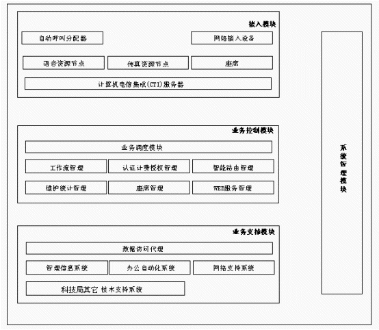 系統(tǒng)管理模塊提供對(duì)全系統(tǒng)完善的設(shè)備管理、網(wǎng)絡(luò)管理、運(yùn)營(yíng)維護(hù)管理、服務(wù)質(zhì)量管理、業(yè)務(wù)信息管理及決策分析等功能,幫助科技局客戶(hù)服務(wù)中心運(yùn)營(yíng)者用好系統(tǒng),把握市場(chǎng)動(dòng)態(tài),不斷提高服務(wù)質(zhì)量。