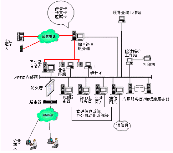 應(yīng)用現(xiàn)代先進(jìn)的CTI技術(shù)建立的科技局公開(kāi)電話(huà)系統(tǒng),改變了傳統(tǒng)的科技局辦公的一部電話(huà)、一支筆、一個(gè)本(或用計(jì)算機(jī)當(dāng)打字機(jī))的記錄、交流模式。在充分利用各級(jí)科技局現(xiàn)有辦公自動(dòng)化系統(tǒng)基礎(chǔ)上,通過(guò)共享科技局、社會(huì)網(wǎng)絡(luò)資源,能夠?yàn)槠髽I(yè)或個(gè)人提供了更多、更好、更便捷的服務(wù)。