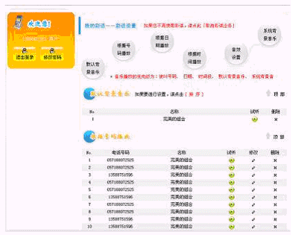 彩話業(yè)務(wù)系統(tǒng)BYBGM2.0功能強大,它允許將被叫分為不同的組或者將其設(shè)置為特殊號碼,這樣將可以設(shè)置他們的默認背景音樂,還可以針對他們設(shè)置紀念日或者按照不同的時段設(shè)置不同的背景音樂。當(dāng)用戶喜歡幾首音樂但又不希望每次都聽相同的音樂時,可以將一定數(shù)目的音樂設(shè)置為一個音樂盒(Music-Box),這樣系統(tǒng)會每次到音樂盒中隨機選取一首音樂作為彩話背景音樂。系統(tǒng)中提供的音樂素材不能滿足用戶的需求時,用戶可以通過"彩話DIY"服務(wù)自己錄制音樂素材到系統(tǒng)中或?qū)⒅付ǜ袷降囊魳匪夭纳蟼鞯较到y(tǒng)中,充分展現(xiàn)自己的個性和創(chuàng)作才華。在通話過程中,用戶也可以隨心所欲控制彩話,這就是"隨心變奏"服務(wù),通過它用戶可以在通話過程中變換彩話背景音樂或音量的大小,這就使得用戶甚至可以編制一個通話場景(不同的背景音樂、不同的音效),并可以根據(jù)被叫的反應(yīng)及時加以控制,從而得以充分展現(xiàn)自己的通話魅力。