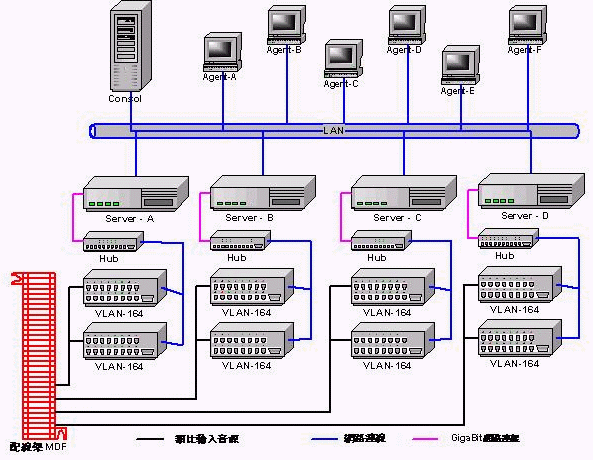 - 系統(tǒng)主要包括二大主機并由網(wǎng)絡(luò)聯(lián)機(TCP/IP協(xié)議)作為彼此與遠(yuǎn)程的溝通橋梁。一是錄音接口主機(VLAN-164)具備模擬輸入音源的匹配接口、音源數(shù)字化、網(wǎng)絡(luò)聯(lián)機輸出。一是數(shù)據(jù)庫服務(wù)器(DataBase
