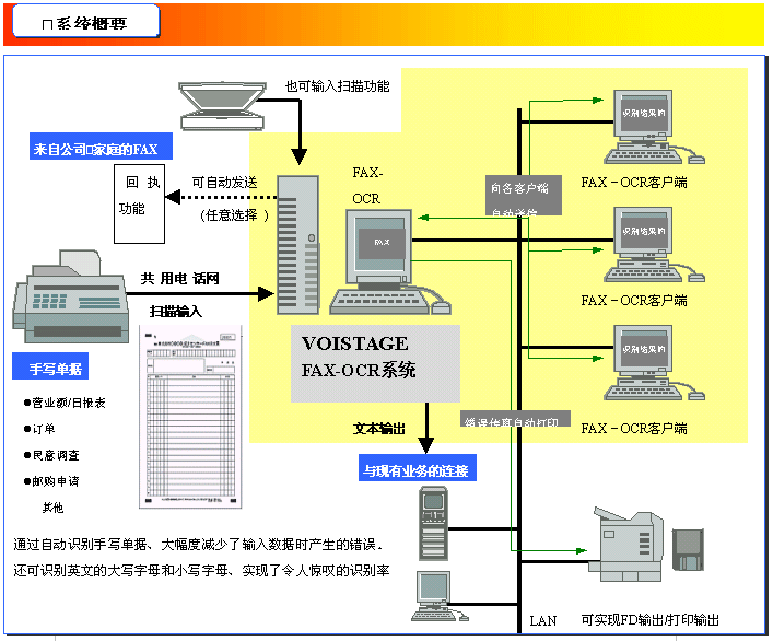 FAX-OCR是日本NTT。模粒裕凉净冢郑铮椋螅簦幔纾瀹a(chǎn)品而開發(fā)的OCR系統(tǒng)。采用了高性能的OCR引擎,具有圖像修補(bǔ)、識(shí)別結(jié)果的修正、確認(rèn)等功能,對(duì)數(shù)字和英文達(dá)到了驚人的識(shí)別率。同時(shí)支持?jǐn)?shù)據(jù)庫(kù),使識(shí)別的數(shù)據(jù)可以直接存入數(shù)據(jù)庫(kù)中,可以方便的調(diào)用、檢索以及與現(xiàn)有的業(yè)務(wù)系統(tǒng)相連接。原有的傳真件也以圖像的方式同時(shí)得到保存,便于日后的對(duì)照。由于FAX-OCR功能巧妙的解決了客戶中大量傳真的輸入、內(nèi)容的提取錄入、方便的檢索、原件的保存以及與現(xiàn)有信息系統(tǒng)相結(jié)合等問(wèn)題,而得到了廣泛的應(yīng)用。對(duì)用戶來(lái)說(shuō),最明顯的效果就是工作效率的大大提高和成本的下降。