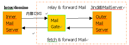 這種方案在有一定規(guī)模的企業(yè)比較典型,內(nèi)部網(wǎng)為Lotus/domino或Exchange的群件系統(tǒng),為內(nèi)部用戶提供smtp, pop3 服務(wù),一般為內(nèi)部IP地址和內(nèi)部帳戶,不具有直接發(fā)送外部郵件的功能。如果要發(fā)送外部郵件,需要配置smtp connector 或smtp-link 等模塊,相當于上圖的MailGate模塊。同時需要更改原有l(wèi)otus/domino 或Exchange 的配置文件。