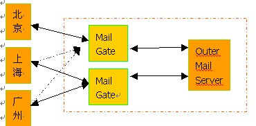 1. 正常工作時北京的內(nèi)部郵件服務(wù)器通過Mail Gate 1與外部郵件服務(wù)器通訊,上海、廣州通過 Mail Gate 2與外部郵件服務(wù)器通訊;