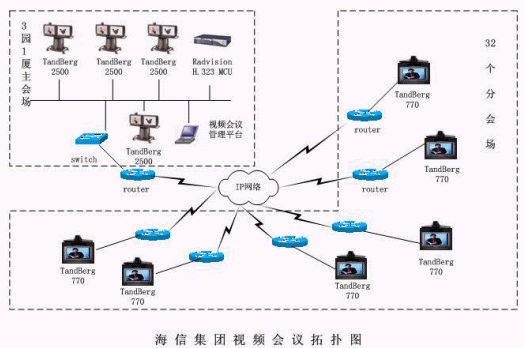 海信集團(tuán)有限公司會(huì)議電視項(xiàng)目的1.152兆共享線路,網(wǎng)絡(luò)設(shè)備采用了CISCO的路由、交換設(shè)備。在選型中,我們?yōu)橹鲿?huì)場(chǎng)配置了TANDBERG2500型號(hào)的產(chǎn)品,在分會(huì)場(chǎng)配置了TANDBERG880型號(hào)的產(chǎn)品。整個(gè)視頻網(wǎng)絡(luò)是分二級(jí)組建的,中心配置了RADVISION的MCU用來召開36個(gè)點(diǎn)會(huì)議。視頻網(wǎng)絡(luò)結(jié)構(gòu)拓?fù)鋱D如下。