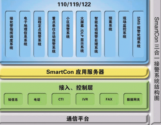 110/119/122等系統(tǒng)和一般企業(yè)的客服系統(tǒng)和熱線系統(tǒng)有一定的共性,但它們肩負(fù)著保障社會(huì)安定和人民生命財(cái)產(chǎn)安全的重任,這些決定了該系統(tǒng)的特殊性,使它有別于其他行業(yè)的應(yīng)用。我們公司依托雄厚的技術(shù)開(kāi)發(fā)力量,結(jié)合多年來(lái)在公安/消防/交通領(lǐng)域豐富的系統(tǒng)研發(fā)實(shí)施經(jīng)驗(yàn)積累,面向未來(lái)的發(fā)展,提出了以SmartCon呼叫中心平臺(tái)為核心的三體合一的、綜合的整體解決方案。該解決方案充分考慮到公安/消防/交通系統(tǒng)的現(xiàn)在和未來(lái)的發(fā)展趨勢(shì),110/119/122三個(gè)系統(tǒng)既可分開(kāi)單獨(dú)處理報(bào)警事務(wù),也可整體考慮、整體調(diào)度。該解決方案涵蓋了電話報(bào)警、SMS報(bào)警、接處警指揮調(diào)度、電子地理信息系統(tǒng)(GIS)、現(xiàn)場(chǎng)監(jiān)視以及小區(qū)報(bào)警雄等等,各個(gè)子系統(tǒng)之間相對(duì)獨(dú)立,用戶(hù)可以根據(jù)實(shí)際要求,進(jìn)行自由搭配,充分體現(xiàn)了系統(tǒng)的靈活性。