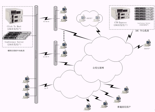 朝陽(yáng)區(qū)政府的中心機(jī)房里放置多臺(tái)FVC公司的Conference Server,實(shí)現(xiàn)支持上千個(gè)并發(fā)用戶的超媒體會(huì)議支撐處理平臺(tái);在中心機(jī)房放置一套完整的超媒體會(huì)議管理系統(tǒng)(Click To Meet),實(shí)現(xiàn)超媒體會(huì)議系統(tǒng)綜合管理平臺(tái);22個(gè)街道辦事處及其下屬的184個(gè)社區(qū)都可以通過(guò)不同的接入方式采用FVC公司基于瀏覽器的軟件終端產(chǎn)品(Web endpoint),參加由朝陽(yáng)區(qū)區(qū)政府或街道辦事處組織的超媒體會(huì)議、遠(yuǎn)程培訓(xùn)、互動(dòng)協(xié)商。每個(gè)工作人員和社區(qū)節(jié)點(diǎn)都注冊(cè)到系統(tǒng)內(nèi)部,都可以利用計(jì)算機(jī)不離開工作地點(diǎn)就進(jìn)行實(shí)時(shí)的音、視頻和數(shù)據(jù)的交互。