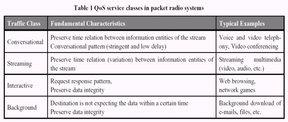 3G無線傳輸堆棧通常由二種不同類型的輸送介質(zhì)組成,專用和共享信道。然而,使用專用信道用戶可以獲得固定帶寬用于傳輸數(shù)據(jù),但使用共享信道用戶只有在動(dòng)態(tài)的帶寬下傳輸數(shù)據(jù),類似于ATM或GSM GPRS。HSDPA將會(huì)成為共享信道在空中的一個(gè)擴(kuò)展。除了MMS,在3G系統(tǒng)的初始階段所有的流媒體和會(huì)話應(yīng)用都希望使用專用信道。 在現(xiàn)代的系統(tǒng)設(shè)計(jì)中,一個(gè)應(yīng)用可以請(qǐng)求許多不同的服務(wù)質(zhì)量(QoS)級(jí)別的其中之一。服務(wù)質(zhì)量級(jí)別包含最大誤碼率、最大延遲和最大保證的帶寬等參數(shù)。此外,通常根據(jù)不同的應(yīng)用分為不同的服務(wù)級(jí)別:會(huì)話應(yīng)用、流媒體應(yīng)用、交互應(yīng)用以及后臺(tái)通信應(yīng)用。特性和典型的例子見表1。