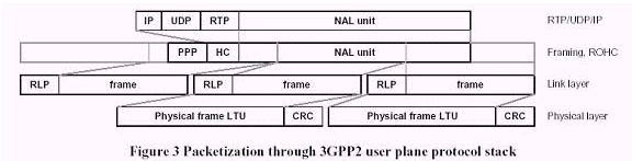 因?yàn)榘粨Q服務(wù),3GPP/3GPP2同意了一個(gè)基于IP的協(xié)議棧。圖3展示了一個(gè)NAL單元通過3GPP2用戶平面協(xié)議堆棧被封裝在RTP/UDP/IP的典型過程。在頭壓縮(RoHC)后,此IP/UDP/RTP包被封裝進(jìn)一個(gè)PDCP/PPP2包,變成了頻率鏈路控制(RLC)和服務(wù)數(shù)據(jù)單元(SDU)。RLC協(xié)議可以在三種模式下工作:透明、非確認(rèn)和確認(rèn)模式。RLC協(xié)議為用戶和數(shù)據(jù)提供分段和重傳服務(wù)。在透明和非確認(rèn)模式,RLC被定義為單向的;在確認(rèn)模式,RLC被定義為雙向的。對(duì)於所有的RLC模式,循環(huán)冗余檢查(CRC)的錯(cuò)誤檢測(cè)在物理層上被運(yùn)行,而且CRC檢查的結(jié)果和真實(shí)的數(shù)據(jù)一起被遞送到 RLC。在透明模式中,沒有上層的協(xié)議被增加到較高層的數(shù)據(jù)中。錯(cuò)誤的協(xié)議數(shù)據(jù)單元(PDUs)可以被丟棄或標(biāo)記為錯(cuò)誤。在非確認(rèn)模式中,沒有重傳協(xié)議在使用中,而且數(shù)據(jù)傳送沒有保證。接受到的錯(cuò)誤數(shù)據(jù)根據(jù)配置來決定丟棄或標(biāo)記為錯(cuò)誤。在確認(rèn)模式中,一種自動(dòng)的重復(fù)請(qǐng)求機(jī)制被用于錯(cuò)誤訂正。