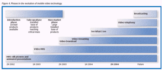 從諾基亞到其它公司,目前有許多具有視頻功能的手機(jī)紛紛出現(xiàn)在市面上。例如,60系列平臺包括了流媒體和視頻播放器功能。獲得60系列平臺許可證的公司有:諾基亞、松下、三星、Sendo和西門子,大致占有全球移動終端市場份額的60%。目前市場上基于60系列的手機(jī)有:西門子的SX-1,三星的SGH-700,諾基亞的7650/3650以及諾基亞的N-Gage。這些手機(jī)立即為發(fā)展商和運營商帶來了市場機(jī)遇,同時也為未來的60系列手機(jī)建立起一個統(tǒng)一的、可運作的商業(yè)應(yīng)用市場。