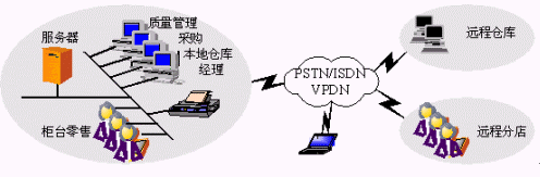 支持遠程庫房、遠程分店以及移動辦公。網(wǎng)絡拓撲結(jié)構(gòu)與連鎖經(jīng)營企業(yè)基本相同。