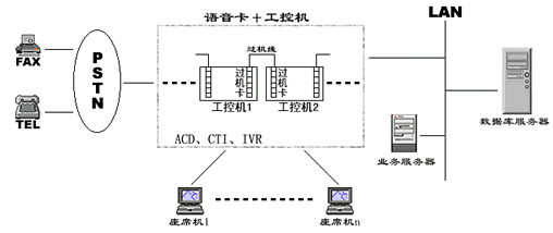 在一些小型CALL CENTER系統(tǒng)中,人們通常通過語音板卡加工控機的方式搭建系統(tǒng),通常一臺設(shè)備就集成了ACD、IVR、CTI等各種資源,各資源的使用、調(diào)派通過軟件進行控制,有效的解決了建設(shè)成本高、系統(tǒng)構(gòu)造繁復(fù)的問題,具有相當(dāng)?shù)撵`活性。然而由于工控機和語音板卡容量有限,同時其標(biāo)準(zhǔn)最多只能是工業(yè)級標(biāo)準(zhǔn),因此在構(gòu)建相對大型的呼叫中心時就總是捉襟見肘。為了增加系統(tǒng)容量,解決多臺PC之間進行通道交換的難題,人們又設(shè)計了過機卡和過機線來解決,其應(yīng)用系統(tǒng)如下圖: