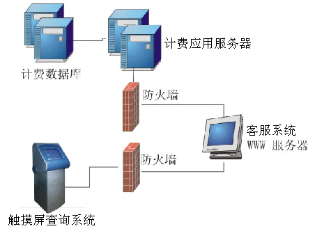 。。觸摸屏查詢系統(tǒng)通過WWW方式訪問鐵通客服系統(tǒng)的WEB服務(wù)器,再由WEB服務(wù)器訪問計費(fèi)系統(tǒng)的應(yīng)用服務(wù)器,由應(yīng)用服務(wù)器上的代理訪問計費(fèi)系統(tǒng)的數(shù)據(jù)庫。由于觸摸屏查詢系統(tǒng)與客服系統(tǒng)WEB服務(wù)器之間、客服系統(tǒng)WEB服務(wù)器與計費(fèi)應(yīng)用服務(wù)器每層都有網(wǎng)絡(luò)防火墻進(jìn)行隔離,同時客服系統(tǒng)的WEB服務(wù)器并不直接訪問計費(fèi)數(shù)據(jù)庫,因此可以保證計費(fèi)系統(tǒng)的數(shù)據(jù)安全。在觸摸屏上用戶除了訪問系統(tǒng)提供的功能以外,不能做任何操作,再次保證了系統(tǒng)的安全可靠。