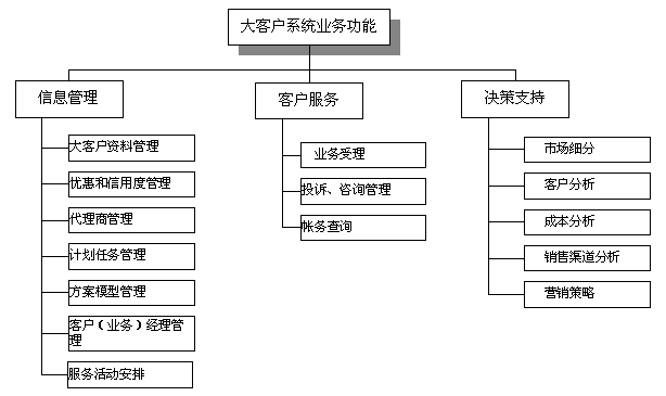 電信大客戶管理系統(tǒng)是在收集大客戶市場調查信息、大客戶資料信息、大客戶經營戰(zhàn)略資源的基礎上,自動采集專業(yè)計費、綜合營帳、客服、網管、財務等系統(tǒng)的相關數(shù)據,實現(xiàn)快速、全面、準確的新客戶業(yè)務受理、新增需求受理及故障處理過程通道,實現(xiàn)完善的客戶經理管理、代理商管理系統(tǒng),最終實現(xiàn)完整的大客戶滿意度評估體系和針對大客戶的個性化服務。建成后的系統(tǒng)從管理、服務、分析三方面出發(fā)主要應具備信息管理、客戶服務、決策支持功能。