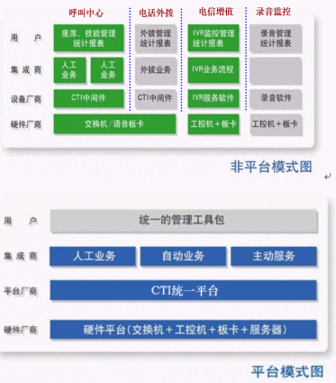 非平臺模式的系統(tǒng)建設(shè)需要采用多家設(shè)備,如不同廠家的交換機、語音板卡、CTI中間件、IVR服務(wù)軟件、錄音設(shè)備,以及相互獨立的、沒有統(tǒng)一設(shè)計的系統(tǒng)維護工具和業(yè)務(wù)界面。而平臺模式的系統(tǒng)建設(shè)只需要采用一家的設(shè)備,各業(yè)務(wù)模式在一個平臺上實現(xiàn),具備統(tǒng)一的管理工具。