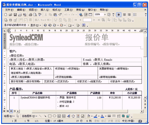 SynleadCRM企業(yè)版4.0很好地滿足了銷售自動(dòng)化管理、服務(wù)自動(dòng)化管理的上述需求,提供了開放的客戶化Word模板,使得用戶企業(yè)能夠根據(jù)實(shí)際情況不斷擴(kuò)展該應(yīng)用?蛻艋0逯苯釉赪ord中編輯,可直觀、方便地插入合并域字段或代碼,只要對(duì)Word稍加了解就可勝任模板維護(hù)工作。
