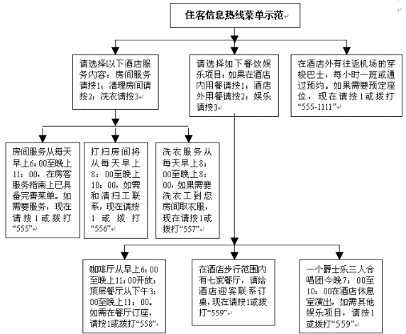 另一個(gè)提高服務(wù)質(zhì)量并可減少工作消耗的方式是讓住客直接從電話中獲取主要信息,特別是那些簡(jiǎn)單、重復(fù)、繁瑣的問題,從而使服務(wù)人員有更多的時(shí)間從事其他工作。