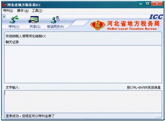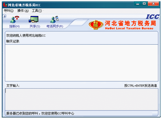 6.登錄成功,納稅人就可以點(diǎn)擊呼叫按鈕,呼叫納稅人所選城市的座席了。左下角的狀態(tài)欄文字提示“服務(wù)器已經(jīng)收到您的呼叫,歡迎您使用ICC呼叫中心”,同時(shí)呼叫按鈕變?yōu)閽鞌喟粹o。如下圖所示: