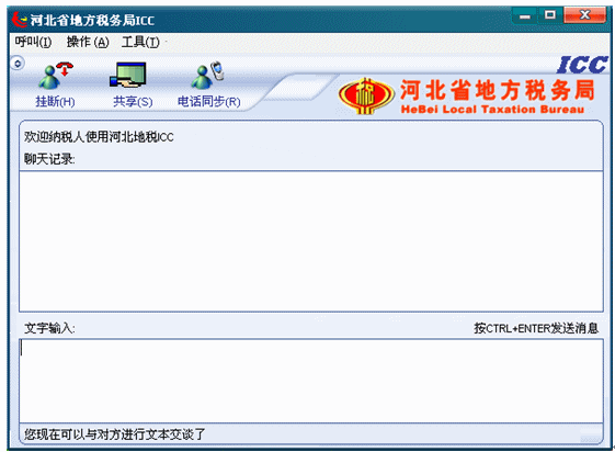 7.等待座席應(yīng)答后,左下角的狀態(tài)欄文字提示首先變?yōu)椤澳F(xiàn)在可以與對(duì)方進(jìn)行文本交談了”,從現(xiàn)在開(kāi)始到納稅人掛斷呼叫期間,納稅人就可以和座席進(jìn)行文本交談了。