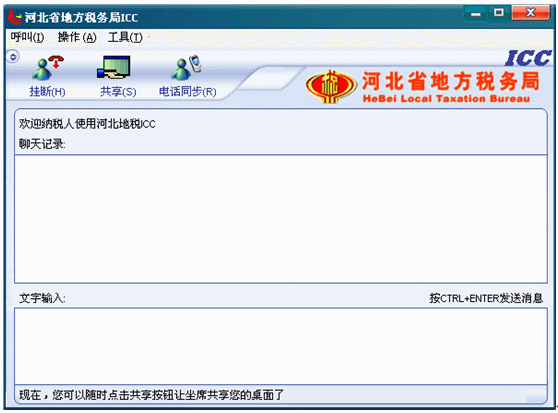 緊接著狀態(tài)文字提示變?yōu)椤艾F(xiàn)在,你可以隨時(shí)點(diǎn)擊共享按鈕讓座席共享你的桌面了”,此時(shí),納稅人如果需要座席共享(看到和操作)納稅人的桌面,就可以點(diǎn)擊共享按鈕,讓座席共享納稅人的桌面了。如下圖: