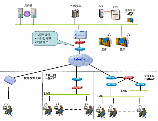 中國(guó)互聯(lián)網(wǎng)現(xiàn)狀:由于IP地址的匱乏,中國(guó)互聯(lián)網(wǎng)基本上是公網(wǎng)、私網(wǎng)同時(shí)并存,并且私網(wǎng)和公網(wǎng)之間經(jīng)常使用防火墻隔離;同時(shí),呼叫中心的座席計(jì)算機(jī)一定處在一個(gè)私網(wǎng)內(nèi)。形式如下: