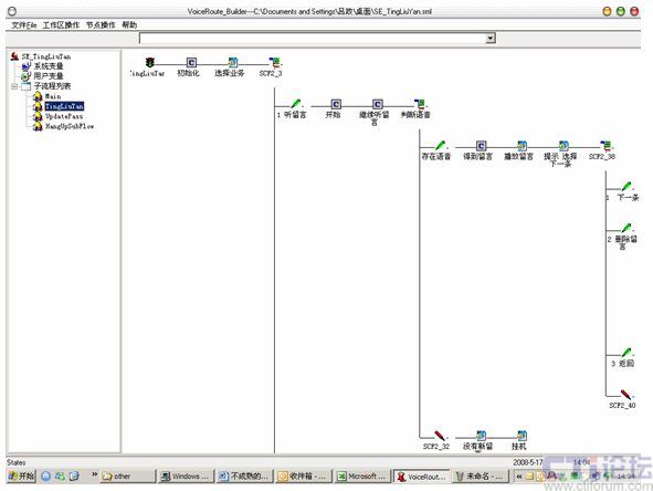 Hi-Link3.0中的IVRBuilder是IVR的流程編輯器,如圖1,它使用國際標(biāo)準(zhǔn)的XML語言描述IVR路程內(nèi)容。IVRParser就是IVR的執(zhí)行工具,它支持動態(tài)加載技術(shù),編輯好的IVR流程放在服務(wù)器指定路徑后就會立即生效,下一個來電就會按照新流程來執(zhí)行。