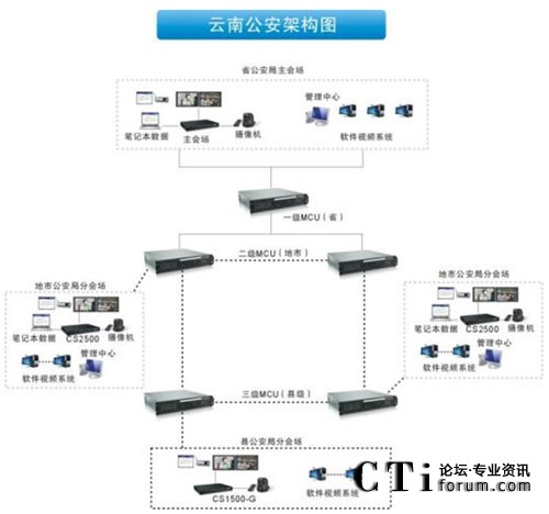 云南省公安廳視頻系統(tǒng)全網建設結構分為三級:共有146臺MCU,使用的是省廳—地州、市—縣級的3級樹狀級聯模式組網。整個項目遍布整個云南省公安系統(tǒng),項目實施至16個地州市、129個縣以及各縣轄區(qū)所有的派出所、戒毒所、看守所。會場數目前約有2200個,還在陸續(xù)增加中。同時支持調用縣級公安局指揮中心監(jiān)控視頻編碼器的實時監(jiān)控圖像。
