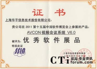 CTI論壇(ctiforum)6月1日消息(記者 潘婷婷): 近日,由工業(yè)和信息化部、國家發(fā)展和改革委員會(huì)、科學(xué)技術(shù)部、國家外國專家局和北京市人民政府共同主辦,中國軟件行業(yè)協(xié)會(huì)、中國電子信息產(chǎn)業(yè)發(fā)展研究院等單位承辦的第十五屆中國國際軟件博覽會(huì)參評軟件產(chǎn)品評獎(jiǎng)揭曉,經(jīng)過專家組的嚴(yán)格評審及在技術(shù)領(lǐng)先性、應(yīng)用價(jià)值等評審指標(biāo)下,由上海市經(jīng)信委軟件展團(tuán)及上海市軟件行業(yè)協(xié)會(huì)共同頒發(fā)華平股份優(yōu)秀組織獎(jiǎng),所參展的 “AVCON UCC統(tǒng)一協(xié)同通訊系統(tǒng)V6.0”、“AVCON視頻會(huì)議系統(tǒng)V6.0”兩款產(chǎn)品被評為優(yōu)秀軟件展品。