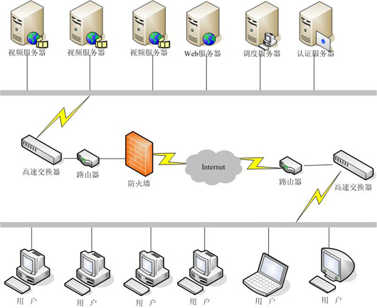 考慮到在線點播的用戶為1000并發(fā),所以使用一臺服務(wù)器就可以滿足需求了,客戶可以通過認(rèn)證后,經(jīng)客戶經(jīng)過調(diào)度服務(wù)器將請求反饋給視頻服務(wù)器,完成視頻點播流程,具體架構(gòu)如圖。
