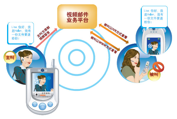 視頻郵件業(yè)務(wù)是在原有的語(yǔ)音郵件的基礎(chǔ)上又增加了極具個(gè)性化的視頻功能。即當(dāng)被呼叫方忙、在3G信號(hào)覆蓋區(qū)以外或是無(wú)法接聽(tīng)時(shí)可以使用視頻郵件的功能。當(dāng)一個(gè)通話呼叫被切換到視頻郵件服務(wù)后,呼叫方首先將會(huì)看到一段視頻的歡迎信息,這可以是通過(guò)視頻片的方式預(yù)先錄制的個(gè)性化的視頻信息,也可以是預(yù)先設(shè)定的一個(gè)卡通形象。呼叫方可以錄下個(gè)人的視頻通話通過(guò)郵件方式傳遞給被叫。