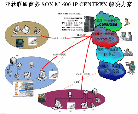 亞軟SOX融合通信解決方案也叫聯(lián)通商務(wù)解決方案,該方案是基于軟交換的可為多個(gè)集團(tuán)用戶提供IP語(yǔ)音解決方案。SOX融合通信解決方案為集群用戶提供了區(qū)別于傳統(tǒng)集團(tuán)內(nèi)部、外部的通信方式,集團(tuán)無(wú)需再購(gòu)置PBX及為其支付維護(hù)費(fèi)用。由于SOX融合通信解決方案是置于IDC托管中心并基于IP軟交換技術(shù),所以沒(méi)有地域限制,具有集群性、可移動(dòng)性等IP通信特征。