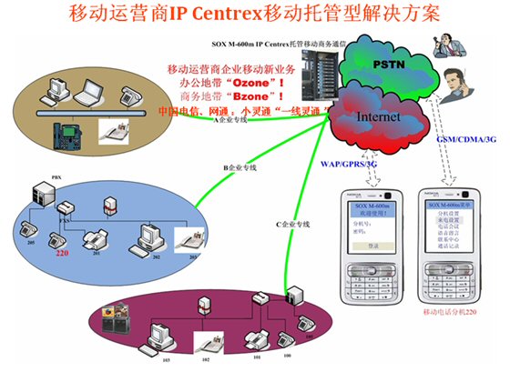 企業(yè)通信總機(jī)必須具備PBX或CENTREX特性,也就是要具備外部的電話呼入和內(nèi)部分機(jī)之間的呼叫控制和交換轉(zhuǎn)接等等功能。IT互聯(lián)網(wǎng)信息時(shí)代的今天,傳統(tǒng)的PBX或CENTREX已經(jīng)不能滿足更多的企業(yè)移動(dòng)性辦公、語(yǔ)音數(shù)據(jù)融合通信以及各種通信協(xié)同工作模式的需要。盡管前兩年移動(dòng)運(yùn)營(yíng)商也推出了移動(dòng)總機(jī),但也僅僅實(shí)現(xiàn)了手機(jī)可以接聽(tīng)總機(jī)的來(lái)電而已,尚且還有很多在今天互聯(lián)網(wǎng)與電信網(wǎng)融合的時(shí)代企業(yè)的實(shí)際應(yīng)用需求無(wú)法滿足。融合通信的時(shí)代急切呼喚著融合、移動(dòng)的企業(yè)通信總機(jī)和分機(jī)的出現(xiàn),SOX-M融合通信移動(dòng)總機(jī)和移動(dòng)分機(jī)應(yīng)時(shí)代的召喚問(wèn)世了。
