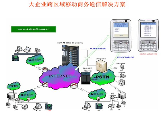 該方案為企業(yè)提供了跨地域的低成本、高效率、方便靈活的IP融合通信基本服務(wù)和增值服務(wù),使用SOX-M就不再有地域限制,宛如本地化電話分機(jī)辦公通信一樣,而且還可以享有更多的增值服務(wù):語(yǔ)音信箱、電話會(huì)議、一號(hào)通、等候音樂(lè)、語(yǔ)音菜單、呼叫篩選等等,更具特色的是提供了融合通信的新型“移動(dòng)總機(jī)”和“移動(dòng)分機(jī)”服務(wù),可以使我們手里的移動(dòng)電話(即手機(jī))完全成為辦公室分機(jī),可以在手機(jī)上完成固定分機(jī)的PBX特性功能,如在線轉(zhuǎn)接,即時(shí)會(huì)議等,通過(guò)SOX-M可以直接管理分機(jī)各種設(shè)置,如“來(lái)電管理、手機(jī)聽(tīng)取語(yǔ)音留言、WAP上召開(kāi)電話會(huì)議、聯(lián)系中心(CRM)WAP點(diǎn)擊呼叫”等等,實(shí)現(xiàn)了語(yǔ)音和數(shù)據(jù)融合通信給企業(yè)帶來(lái)的更多好處。