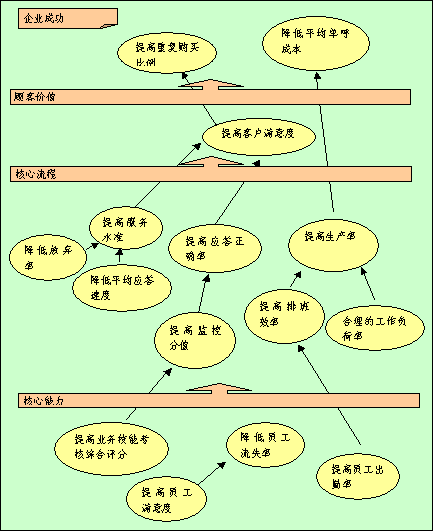 全程全網(wǎng)考核策略目標(biāo)因果關(guān)系圖是"平衡計(jì)分卡"應(yīng)用的重要環(huán)節(jié),在此要特別強(qiáng)調(diào)?因?yàn)樗菍⒏鶕?jù)公司遠(yuǎn)景規(guī)劃以及使命確定的四個(gè)考核維度轉(zhuǎn)化為全程全網(wǎng)考核系統(tǒng)進(jìn)入實(shí)際操作階段之關(guān)鍵步驟。在平衡記分卡的設(shè)計(jì)過程中,它起著承前啟后的作用,在構(gòu)建呼叫中心全程全網(wǎng)考核系統(tǒng)中全程全網(wǎng)考核策略目標(biāo)因果關(guān)系圖的突破性銜接功能-以其邏輯性的架構(gòu)來界定和描述實(shí)現(xiàn)全面績效考核的策略方案。將公司成功、客戶價(jià)值、核心流程和呼叫中心核心能力之間的關(guān)聯(lián)清晰地呈現(xiàn),并將企業(yè)的策略與其績效衡量系統(tǒng)相銜接。
