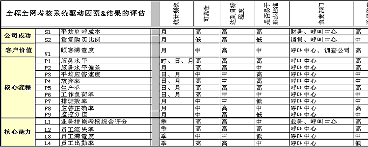 上表為與全程全網(wǎng)考核策略目標(biāo)相匹配的驅(qū)動(dòng)因素指標(biāo)與結(jié)果指標(biāo)的列示。