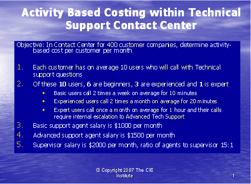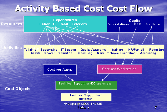 呼叫中心業(yè)務(wù)包括大量單獨(dú)的行動(dòng) — 行動(dòng)成本法(ABC)使我們跟蹤那些行動(dòng)以至于更清楚地了解支持一個(gè)客戶的所需事項(xiàng)。傳統(tǒng)上,呼叫中心成本是根據(jù)投入來衡量的:人數(shù),設(shè)備量,設(shè)施的規(guī)模。為了了解服務(wù)一個(gè)客戶所花費(fèi)的成本量,呼叫中心的主管必須確定這些行動(dòng)如何與該客戶相聯(lián)系的。只有做到這一點(diǎn),行業(yè)才能知道來自該客戶的收入是否超出為其提供服務(wù)所產(chǎn)生的成本。如果服務(wù)的成本大于收入,那么這個(gè)客戶對(duì)于行業(yè)來說是無利可圖的,所以確定哪些客戶有利可圖和哪些客戶無利可圖是很重要的,這樣,行業(yè)才可以根據(jù)客戶定價(jià)和客戶服務(wù)策略有利地進(jìn)行管理。