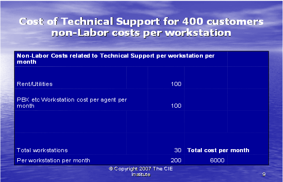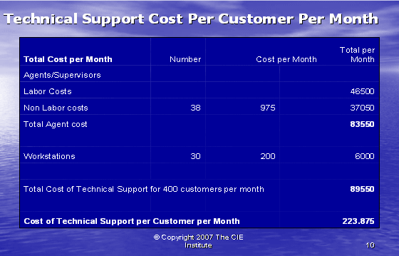 根據(jù)圖表12,我們可以算出第二種方式的利潤百分比。如果我們假設(shè)每個(gè)客戶每年的收入是20,000美元,其中分配給呼叫中心部門的收入是20%。我們每個(gè)客戶每月的收入是333.33美元,每個(gè)客戶月的成本是223.88美元(參見圖表10)。這導(dǎo)致我們來自每個(gè)客戶每月的利潤是109.46美元——這將產(chǎn)生33%的利潤率。