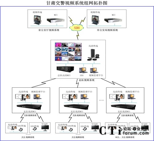 本次建設(shè)的交警總隊(duì)視頻會(huì)議系統(tǒng),包含覆蓋全省交警總隊(duì)、多個(gè)支隊(duì)、大隊(duì)、中隊(duì)的大型視頻會(huì)議網(wǎng)絡(luò)。其中包含了2個(gè)總隊(duì)會(huì)場(chǎng)16個(gè)支隊(duì)、100個(gè)大隊(duì)與16個(gè)中隊(duì)。交警總隊(duì)、支隊(duì)、大(中)隊(duì)與省公安廳、市州公安局通過(guò)SDH專(zhuān)線(xiàn)進(jìn)行交互訪(fǎng)問(wèn),支隊(duì)與市州公安局、大隊(duì)與區(qū)縣公安局、總隊(duì)到各支隊(duì)的網(wǎng)絡(luò)均為專(zhuān)線(xiàn)聯(lián)接。