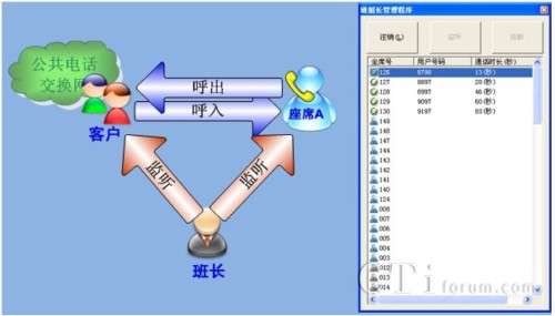 是提供給班長的一個監(jiān)控的平臺,并能對座席員工進(jìn)行監(jiān)聽強(qiáng)插強(qiáng)拆等功能,加強(qiáng)了公司對服務(wù)的有效管理,保證了服務(wù)的質(zhì)量。