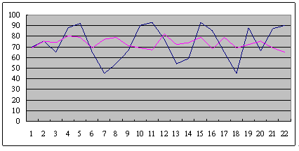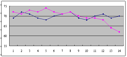 這是兩個(gè)呼叫中心從早上8點(diǎn)開始,一直到晚上6點(diǎn),每隔半個(gè)小時(shí)的服務(wù)水平。可以很清楚的看到,藍(lán)色這條線,它服務(wù)水平在91到48這中間震蕩,平均服務(wù)水平是73左右,粉紅色這條線,雖然平均服務(wù)水平也是在73左右,但震蕩幅度卻小了很多,服務(wù)水平只在81到68這中間震蕩。