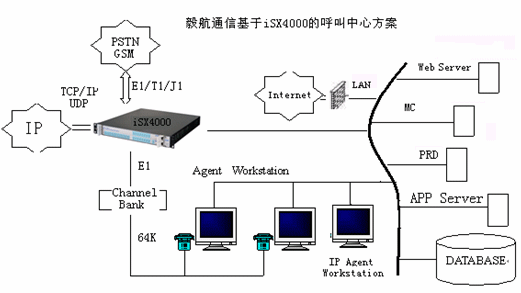 相對于現(xiàn)在的兩種主流呼叫中心方案,毅航通信基于iSX4000呼叫中心解決方案直接整合了Internet的接入。傳統(tǒng)由IVR完成的操作也可以通過Web頁面上的流程實現(xiàn),這樣用戶通過下拉菜單、簡單填寫、點擊按鈕等操作完成客戶識別、業(yè)務(wù)識別等操作,這些流程完成后,通過VoIP對呼叫中心呼入,由呼叫中心對呼入進(jìn)行受理,再按照相應(yīng)的原則分配到座席,座席再作相應(yīng)的應(yīng)答和處理,從而為客戶提供了一個通過Web站點直接進(jìn)入呼叫中心的途徑,把Internet所具有的豐富信息資源和強大的功能賦予呼叫中心,它向客戶提供一個可訪問的Web站點,使得呼叫中心從“撥叫到交談(Dial to Talk)”發(fā)展到“點擊到交談(Click to Talk)”,通過Internet可以提供IP電話語音呼叫、Call Back、IP傳真、IM、E-mail等功能,擴展了通信渠道,一方面用戶可以實現(xiàn)免費接入到呼叫中心,另一方面企業(yè)能夠向更多的客戶提供優(yōu)質(zhì)、方便的服務(wù)資源,而且由于這些資源的價格相對傳統(tǒng)通信便宜,使企業(yè)為客戶提供全國、乃至于全球服務(wù)成為可能,提高了企業(yè)客戶服務(wù)水平,增強了企業(yè)競爭力。毅航通信統(tǒng)一呼叫中心解決方案系統(tǒng)結(jié)構(gòu)如圖所示: