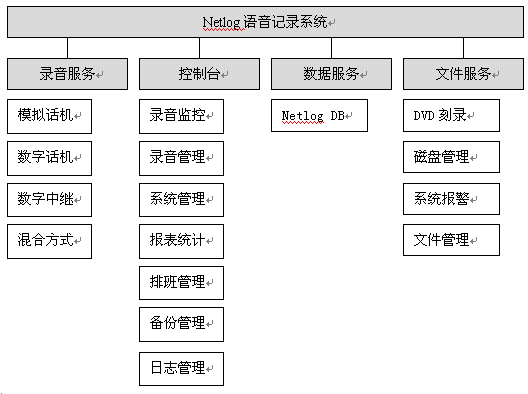 NetLog語(yǔ)音記錄系統(tǒng)采用基于分布式、多層控制管理體系的設(shè)計(jì)思想,將電話線路與內(nèi)部網(wǎng)絡(luò)有效地結(jié)合在一起,形成一套完整的語(yǔ)音錄制、管理系統(tǒng)。采用目前先進(jìn)的C/S模型,能更方便、快捷地實(shí)現(xiàn)控制臺(tái)對(duì)網(wǎng)絡(luò)內(nèi)所有記錄服務(wù)的狀態(tài)監(jiān)視,記錄查詢,操作控制等,采用統(tǒng)一的管理化機(jī)制,使文件的管理和備份更簡(jiǎn)潔。