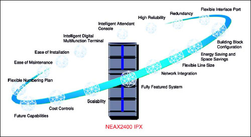 NEC也將IP引入了NEAX2400 IPX系統(tǒng)中。這使得當(dāng)NEAX2400 IPX配置在IP網(wǎng)絡(luò)時(shí),可以提供所有的NEC網(wǎng)絡(luò)服務(wù)及Dterm系列數(shù)字話機(jī)的功能。