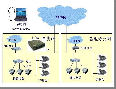虛擬辦事處/分公司: 企業(yè)沒有常駐辦公機構(gòu)的地區(qū),可以通過 IPX 系統(tǒng)將用戶的電話咨詢通過 INTERNET 傳輸?shù)娇偛刻幚。當(shù)卦O置一套網(wǎng)絡電話終端