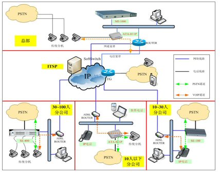 3.10至30人的分公司:通過增加桌面型IP-PBX(SE-30)及IP話機終端的方式改造。SE-30提供2路Bypass口,當網(wǎng)絡中斷時,可以作為連接PSTN的中繼端口;用戶終端采用IP話機或語音網(wǎng)關,實現(xiàn)小規(guī)模的網(wǎng)絡電話應用。