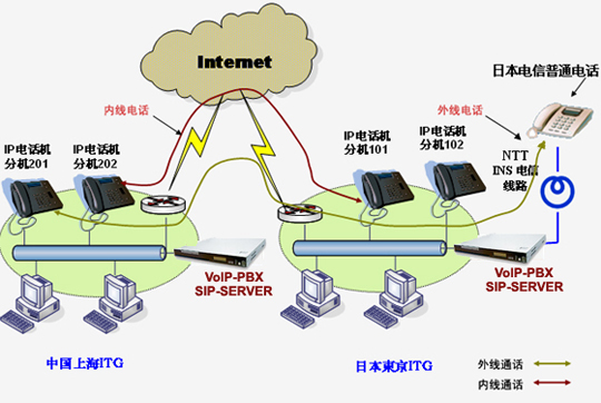 上海愛吉研發(fā)的VoIP-PBX軟交換系統(tǒng)已經(jīng)成功地在上海愛吉和日本愛吉以及日本的客戶間實(shí)施。目前應(yīng)用上海愛吉生產(chǎn)的VoIP-PBX產(chǎn)品,可以實(shí)現(xiàn)從上海愛吉的任意IP電話機(jī)撥打內(nèi)部分機(jī)號(hào),例如:101,成功實(shí)現(xiàn)從Internet互聯(lián)網(wǎng)接通位于日本東京的日本ITG或日本OKI公司的IP電話機(jī),而不產(chǎn)生任何的電信費(fèi)用。另外,目前通過(guò)日本的NTTINS 交換機(jī),還實(shí)現(xiàn)了從上海愛吉的IP電話機(jī)可以撥打日本方面的任意普通電話,即日本電信范圍內(nèi)的任意普通電話,而僅僅產(chǎn)生從日本ITG到日本其它地方的短途或國(guó)內(nèi)長(zhǎng)途費(fèi)用,而沒有上海到日本的國(guó)際長(zhǎng)途費(fèi)用。具體的網(wǎng)絡(luò)應(yīng)用圖如下所示: