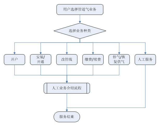 業(yè)務(wù)咨詢(xún):用戶(hù)通過(guò)人工、自動(dòng)語(yǔ)音等方式咨詢(xún)有關(guān)政策法規(guī)、資費(fèi)標(biāo)準(zhǔn)、用氣常識(shí)、報(bào)裝方法等,系統(tǒng)以語(yǔ)音、傳真、Email、短消息等方式回復(fù)客戶(hù)。
