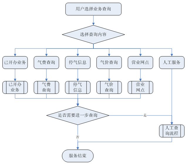 業(yè)務(wù)查詢(xún):用戶(hù)可通過(guò)受理人員或自動(dòng)語(yǔ)音應(yīng)答系統(tǒng)根據(jù)用戶(hù)要求從數(shù)據(jù)庫(kù)查詢(xún)資料,然后通過(guò)語(yǔ)音方式播報(bào)或送到用戶(hù)指定傳真機(jī)或其他終端設(shè)備上。應(yīng)考慮以后用web方式查詢(xún)氣費(fèi)等數(shù)據(jù),以不動(dòng)及主體設(shè)備方式平滑升級(jí)。
