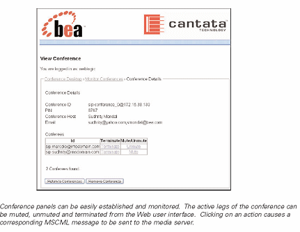 該應(yīng)用是利用BEA WebLogic workshop編寫的,運(yùn)行于 BEA WebLogic SIP 服務(wù)器上。用戶通過BEA WebLogic門戶提供的圖形界面建立會(huì)議。BEA WebLogic SIP 服務(wù)器利用SIP協(xié)議與Cantata SnowShore IP Media Server(Cantata SnowShore IP 媒體服務(wù)器)進(jìn)行通信,同時(shí)它還使用了MSCML控制媒體處理功能。通過使用XMLBeans, 該應(yīng)用產(chǎn)生并編譯了MSCML。XMLBeans是一個(gè)由BEA公司開發(fā)的開源XML綁定工具。 BEA WebLogic Workshop工具使得開發(fā)人員可以很容易地創(chuàng)建這些通過使用SnowShore 媒體服務(wù)器開創(chuàng)的面向Web的SIP和XML接口的融合應(yīng)用。