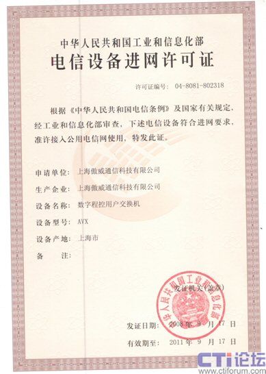傲威通信AVX系列語(yǔ)音電話(huà)交換機(jī)獲得“電信設(shè)備進(jìn)網(wǎng)許可證”