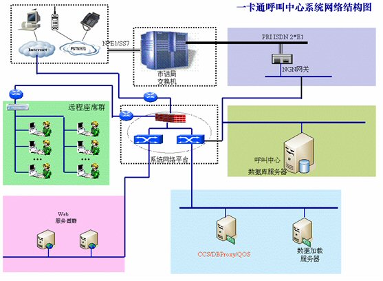 圖形說明:其中黑色的線表示ISDN專線,藍色的線為網(wǎng)絡線。其中CCS/DBProxy/QOS服務器為目前系統(tǒng)的CTI服務器立舊,在CTI服務器上安裝3個服務程序(CCS、DBProxy、QOS),考慮到系統(tǒng)的安全與備份,我們在數(shù)據(jù)加載服務器上同時也安裝這3個程序備用(CCS、DBProxy、QOS)在遇到機器故障時可以啟用備份系統(tǒng),詳細的系統(tǒng)啟用參見系統(tǒng)的使用手冊。